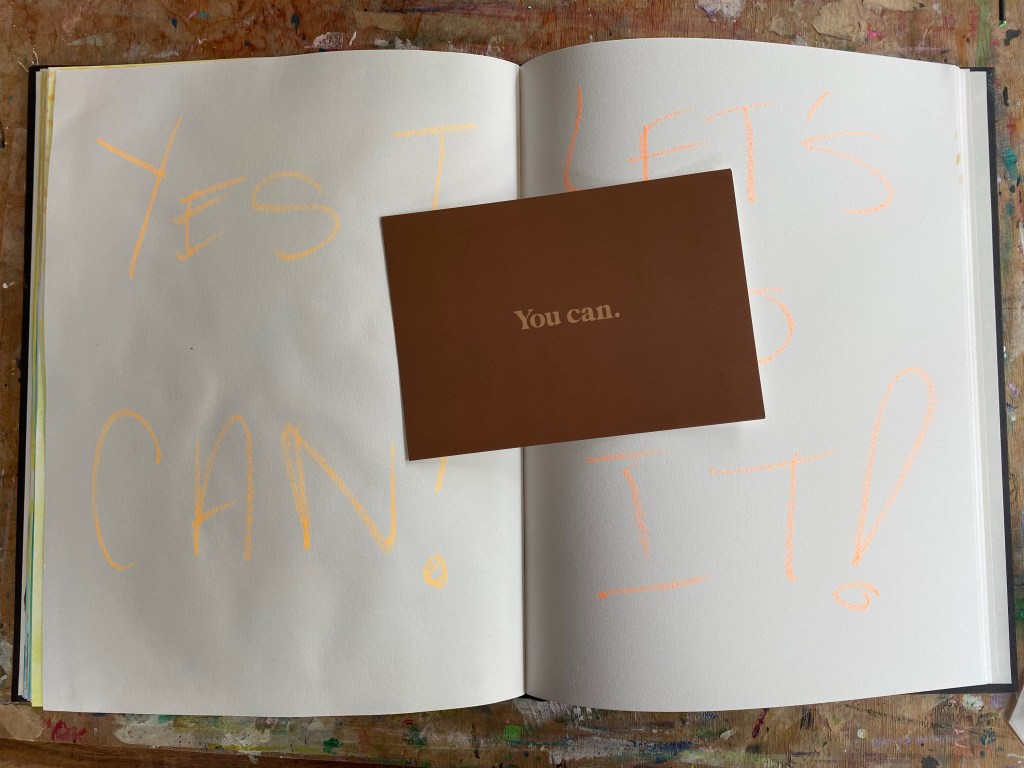 Although workout is not possible for the time being, I take this opportunity to catch up on stuff I’ve been putting off. Light reorganising of house, working on the garden a bit (without bending my knees obviously) and of course plenty of creative hobbies! Those should be enough to get my endorphins stimulated. And how convenient this postcard turned up in the middle of all the art supplies rubble on my desk. It came with some stuff I ordered from Splendith, a Dutch art supplies webshop: “You can” it simply states. I was definitely intending to use it! And hence on a two-page spread on my Strathmore sketchbook, I scribbled with OMY’s neon shaded oil pastel “Yes I Can” and “Let’s Do It!”