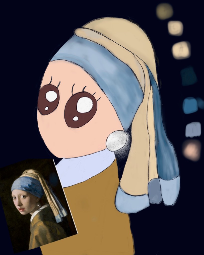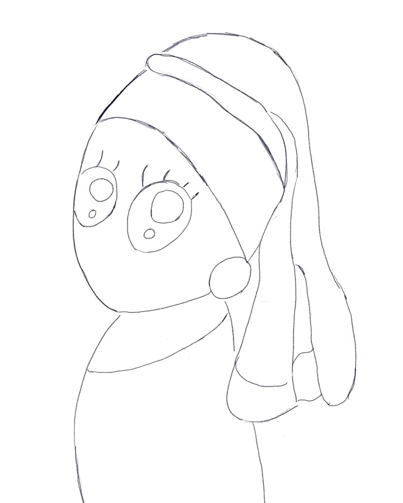 Digital art would be a good start before I pursue a proper painting. Initially, my idea was pencilled in my small sketchbook. I was intent on a kawaii anime version of the painting, along with the exaggeratedly huge eyes and, as my style, no mouth or nose. The head is a bit more elongated compared to the sort of characters I draw, but I wanted a closer resemblance to Vermeer’s. Once good enough, it was photographed on my phone before being imported onto my Procreate app. The outlines were then closely traced over with the Procreate Pencil. So far so good…