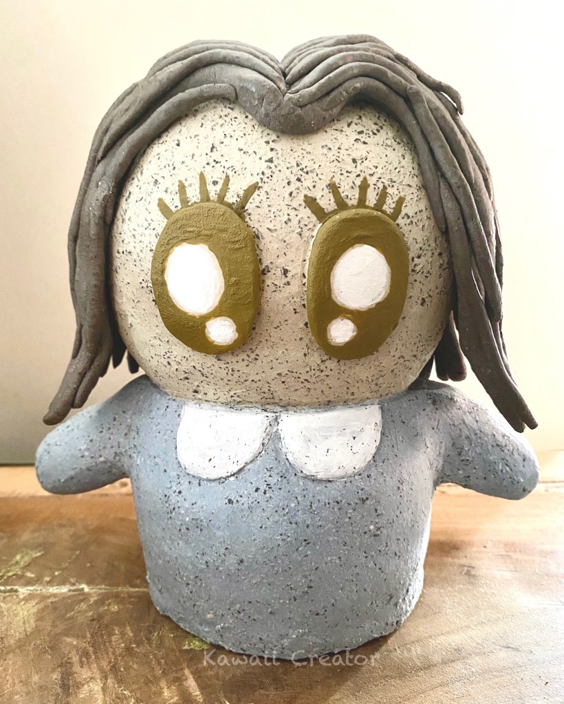 The figure was then left to dry for a day or two once the figure was completed. This is so that the surface is not too moist to paint on. Before Little One goes into the kiln for the first firing though, I painted her collar and part of eyes white. Two layers of the white paint were applied. Then into the kiln overnight at 900℃. With the time it takes for the temperature to rise to that level then later cool down slowly so the ceramics do not break at a sudden drop in temperature, overnight is quite normal. Note the difference of clay colors before and after! The face is whiter, the torso a lighter blue and the hair greyer. As for the eyes, I painted them light brown and another layer of white was applied where I had already painted. A pity some of the eyelashes indeed fell off during the firing, but it was a blessing. Now they look much more “Little One” with the lashes painted on instead, don’t you think?
