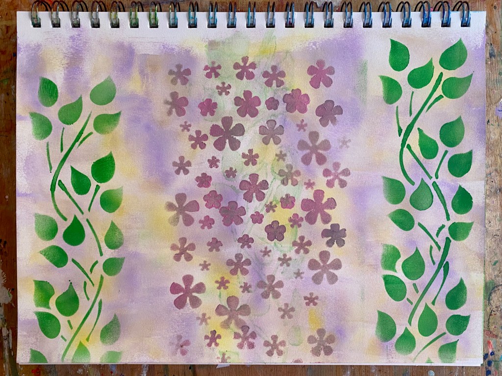 The background of purple and yellow came from the excess paint from a previous artwork, applied on an empty sketchbook page with a brayer. From there, I created a few stencil designs of leaves and flowers by gently tapping some acrylic paint with a sponge. It took me a while to figure what my next step would be, but I thought I’d keep playing around with various mark-making tools and see what happens!
