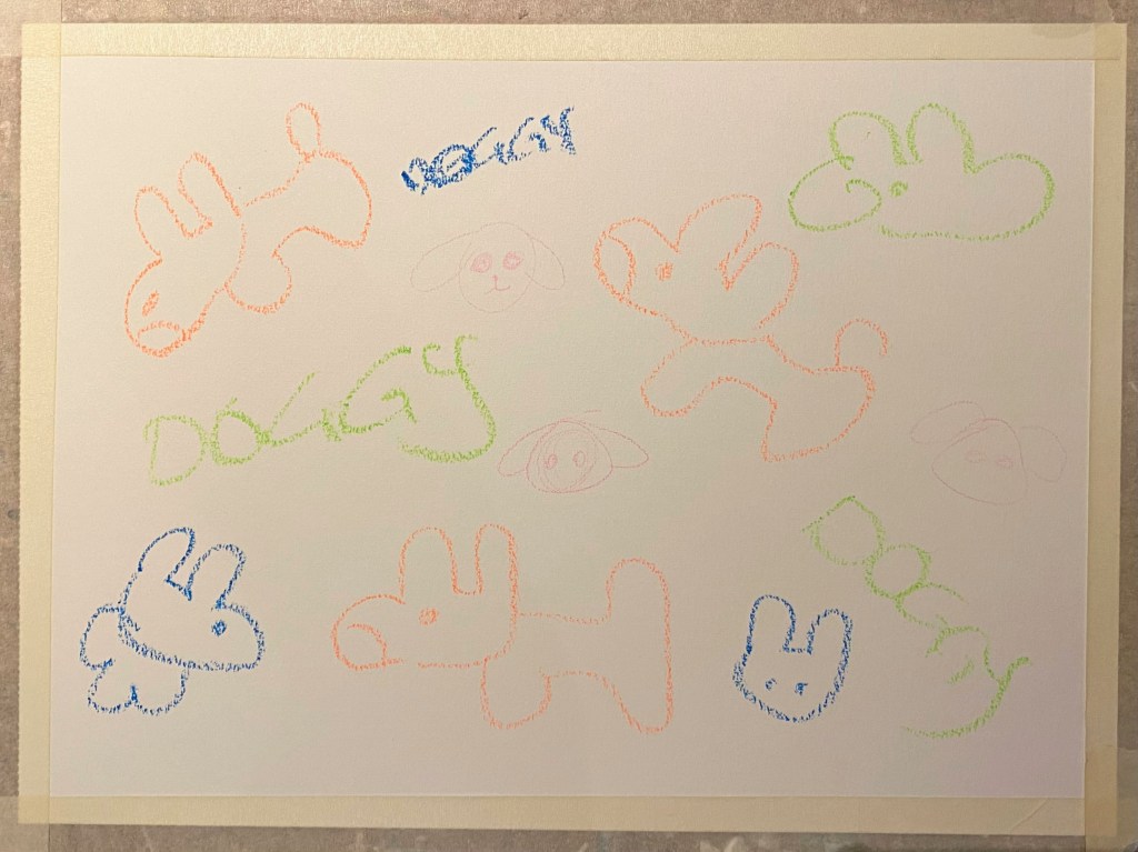 Blocks of color were then introduced. Before that, though, I wanted to include Little One in the picture! She was then penciled in at the last minute walking her little doggy too. And now the painting journey begins. I stuck to more earthy tones like Antelope Brown, but went for two shades each of green and blue. Next the doggies were colored in fluorescent orange, pearly violet or light pink. Notice how the oil pastel doodles show through. So far looking promising!