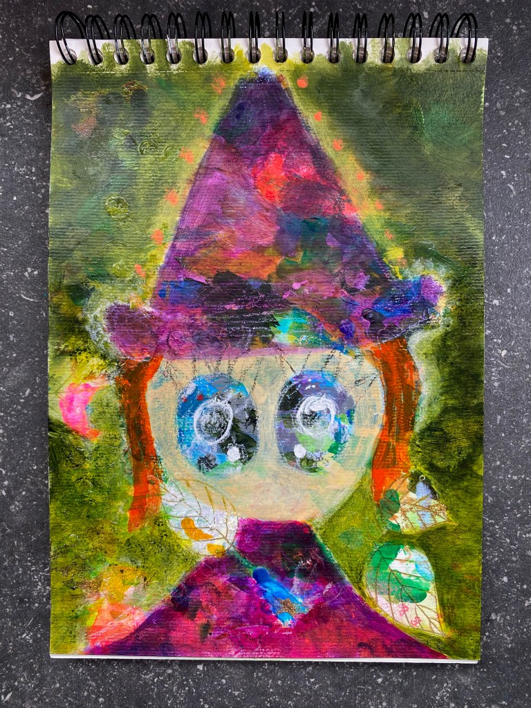 I wanted Wilma to have a purple outfit this time. With the hair being a shade of dark orange, a green background seemed a sensible choice to create a triad of secondary colors (purple, green and orange). The background was firstly painted, although I worked back and forth between the subject and the background. Golden Fluid Acrylics were mainly used here: Sap Green Hue, Green Gold and Titan Buff for the background and Ultramarine Violet and Quinacridone Magenta for the costume with a bit of Fluorescent Red dabbed on for the color to pop out. Good thing I didn’t go too heavy handed with painting the costume as I love how the colors below show through. Also, as I was working on another project involving fluorescent orange 3D paint, I gently dotted the excess along the hat. Looking good so far!