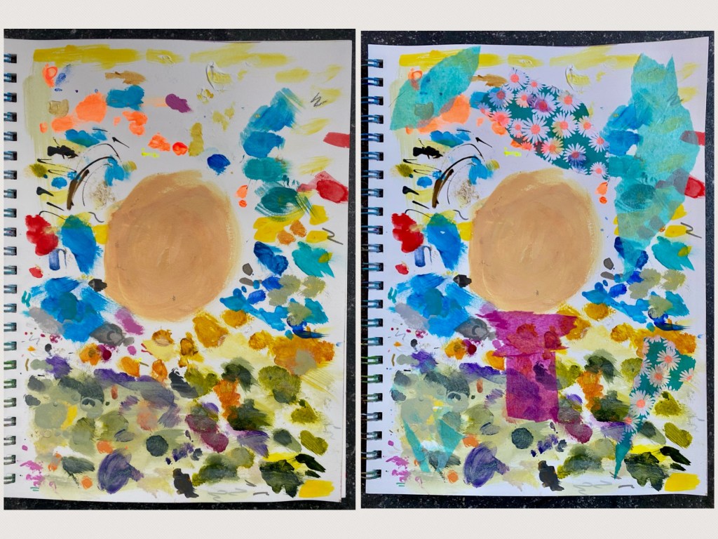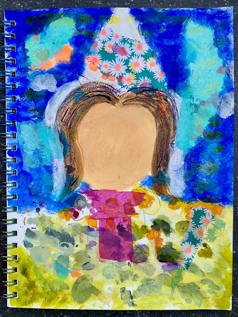 It all started out with a page from my Strathmore’s Mixed Media sketchbook filled with splotches of paint. And how did that come about? Whenever I am working on a painting, I typically use another piece of paper as a palette to test, mix or wipe excess paint on so nothing goes to waste. The palette surface is then used to recreate another painting! Once I was ready, I firstly glued a few collage pieces like scrap wrapping paper and tissue wrapping to begin with. Having painted in the flesh-colored round shape to rid of excess paint at the time certainly gives us a good start for the face!