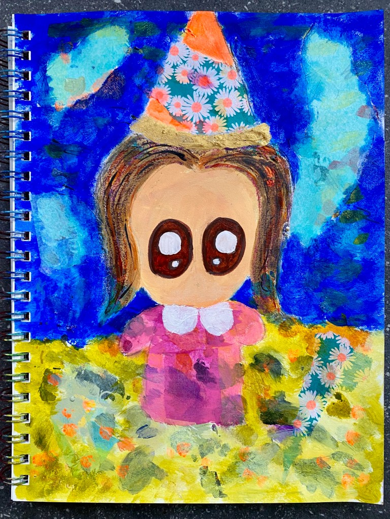 As I didn’t want to lose the flower wrapping paper in the picture, I thought of Little One in a tall party hat! Negative space was then created in the sky using Golden’s fluid acrylic paint in Ultramarine Blue. What a lovely color! I also wanted to keep the light blue pieces of the collage paper and also worked around it. For the hair, some strands were drawn with purple oil pastel along with the tip of a dropper from Sepia acrylic ink which was then spread with a wet brush. And now I was ready to color the ground. Golden Fluid acrylic in Green Gold was chosen, with a bit of Titan Green to add some opacity. So far looking good!