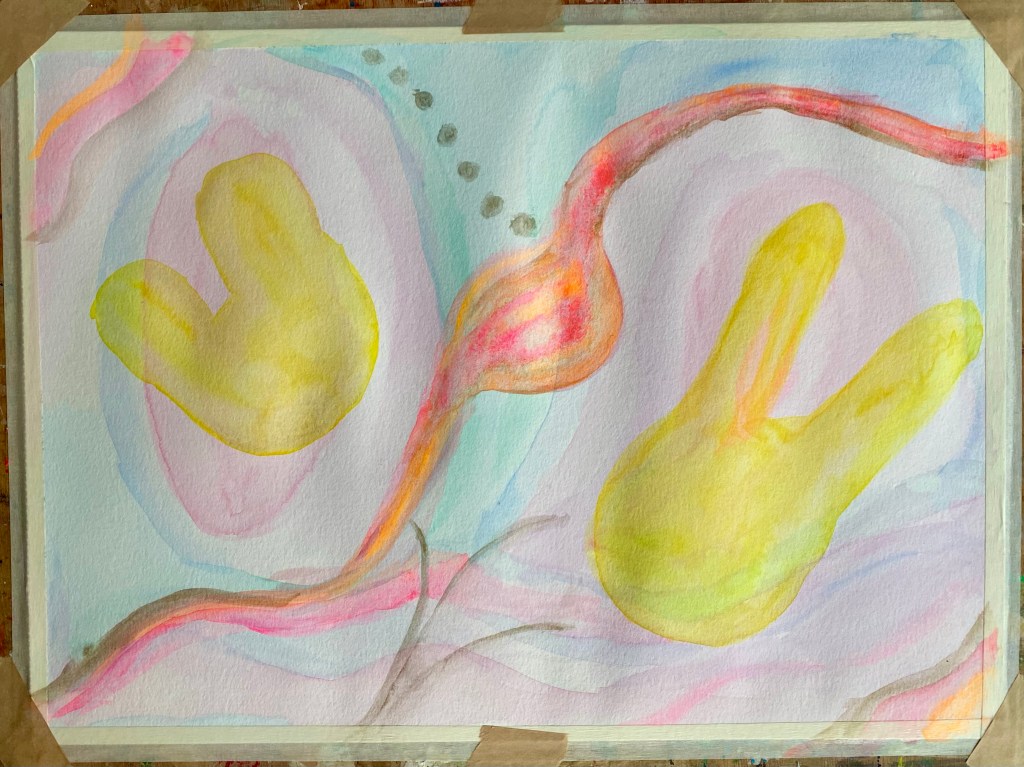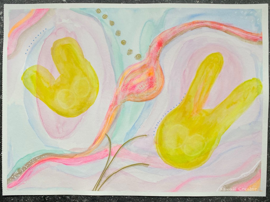 Noticing how the colors, though beautiful, were rather cool shades, warmer tones of yellow and gold were introduced. How about some kawaii shapes like bunny and teddy bear heads? Important thing is to let the first layer dry completely before painting over it with a complimentary shade so they don’t mix and get muddy. And love how the bottom layer shows through too! I then thought it would be an idea to incorporate neon pink and orange to make the painting more interesting…