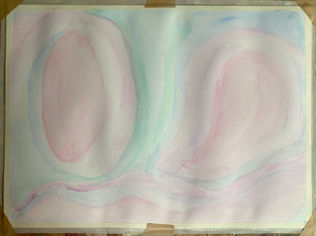 With a big calligraphy brush, I set about filling in the sheet with some curves and round shapes. Pink first, followed by complimentary shades of violet and lavender then moving along the color wheel onto blue then eventually green.