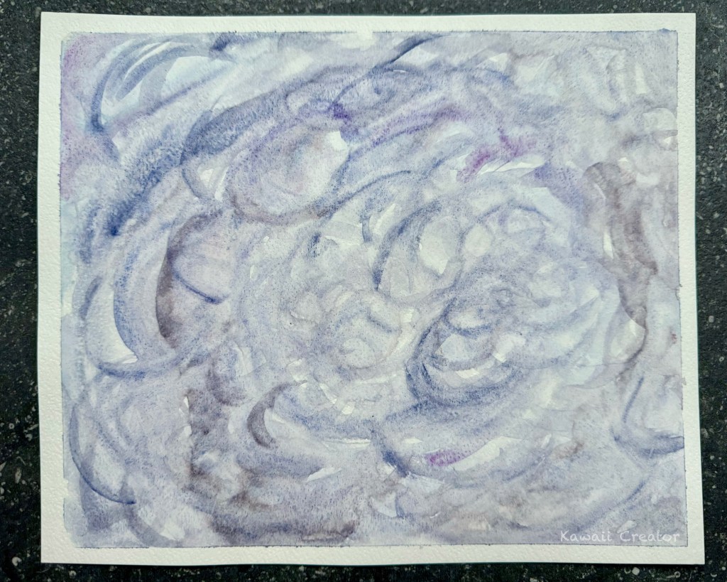 What was originally intended to be a painting of a sheep,though, turned out to be an abstract piece. Once I began, I realised it was not going to work and there was no way out of it. It was not properly drawn from the beginning, and as you know with watercolor you can’t go over it or erase it. So… I just continued and merely played around with this magical watercolor and practice circular strokes with my new thick calligraphy brush. And how amazing this turned out to be! I showed it to my boyfriend who told me how beautiful it looked and not to change a thing. Perhaps he was right. How about turn it into an abstract painting? Whatever your interpretation may be, I am even inclined to thinking that this plethora of circularstrokes could indeed resemble a close up of a sheep’s curly fur! Now a good example of a beautiful mistake…