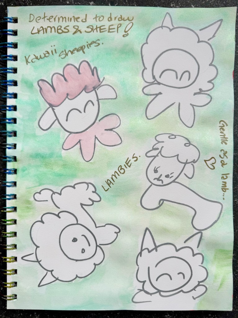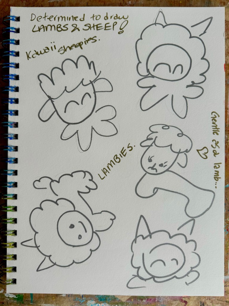 I’m rather pleased how this quick painting turned out. Just some brisk doodles simply filled in with gouache paint along with a bit of glitter and shine. I do love the Turner gouache too which is as good as the Holbein brands. Following this practice, I hope to be able to create another sheep and lamb painting shortly. Perhaps even include Little One in it, as she enjoys going for neighborhood strolls and seeing all the cute lambs roaming around the fields!