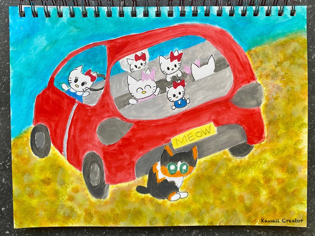 And here comes the digital version: First I imported the photo this painting onto my Procreate app. The outline was then traced over with the Procreate pencil followed by filling the colors in with the Medium Airbrush. Some of the smaller areas, such as the Hello Kitty ribbons, were tedious but nevertheless exciting to continue. As for the background, how about a change from the same old “sky and ground”? It is no longer autumn and hence something more spring would be great by introducing some textures with some stamps and the Leafy Solid brush. Including shadows from the car would further make it look like the car is on the ground rather than floating in the air. I had initially considered making the car more metallic but left it as it is. Only the letters “MEOW” on the number plate were written in glitter. Et voilà that wasn’t too difficult was it?