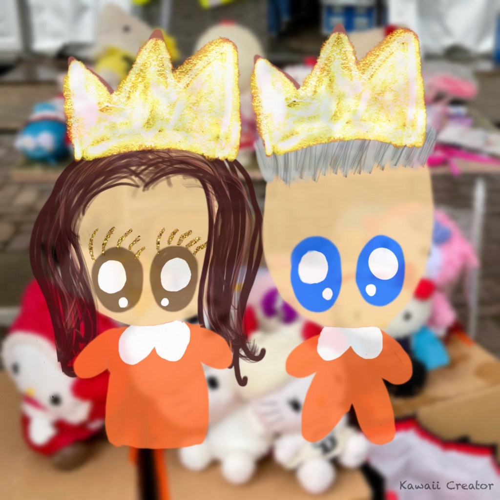 And now, time to paint us! Worked in many layers for the subjects, assigning one for each part of our bodies (head, hair, torso, eyes, crown etc) Main brush used was Procreate’s own Medium Airbrush. It was only the crown which was painted in gold with Hot Foil Lettering along with my lashes in gold Glitter Calligraphy, both from the Gold Rush set of brushes (purchased in Creative Market). And why are we wearing orange might you ask? It has been the color symbolizing the Dutch royal family for many centuries and hence, orange is worn by everyone on this special occasion. I then merged the layers of my and my partner separately to resize and reposition before reducing opacity to 85% so the Hello Kitty background shows through. And now!