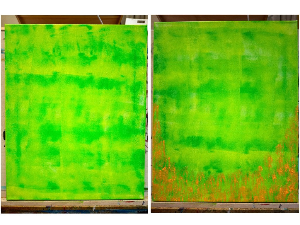 This painting was actually done during my Tuesday evening abstract art classes with Dieter Klassen. In this class, we were to play around with texture using plaster. Modellling paste could easily be used, but here we were to create texture in large areas. First we painted our background using a big brayer. A combination of yellow-green and permanent green were introduced here which resulted in a rich but vivid shade. Uncertain of the next step, I decided to take the plunge and try a layer of bright orange but regretted it because the paint did not came out as expected; I was hoping for a few spots but apparently I had too much paint on the brayer. Luckily, it did not get applied over the entire canvas but just partially on the bottom. And now I quite liked that! Once the paint dry, an interesting texture resulted. Now that’s what I call a beautiful mistake!