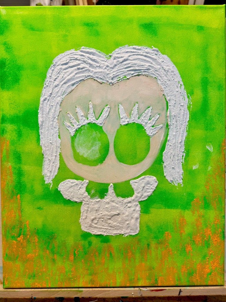 And here comes the plaster! Dieter mixed the plaster for us, and with a palette knife, we carefully spread it at the desired area. After having drawn my Little One with the pencil on canvas, I went for the hair, lashes and outfit, making sure the plaster was evenly and thoroughly applied. What I should have done in hindsight, though, was paint the face first before spreading the plaster to avoid the visible gap between it and the paint. Not to worry, we can rectify that. Compared to Modelling Paste, the plaster was a bit more fluid and less chunky in consistency. The result is that you get a more even application with less rough edges. As said earlier, plaster is more suitable for large areas as well. And now we let it dry and continue with the painting the next lesson!