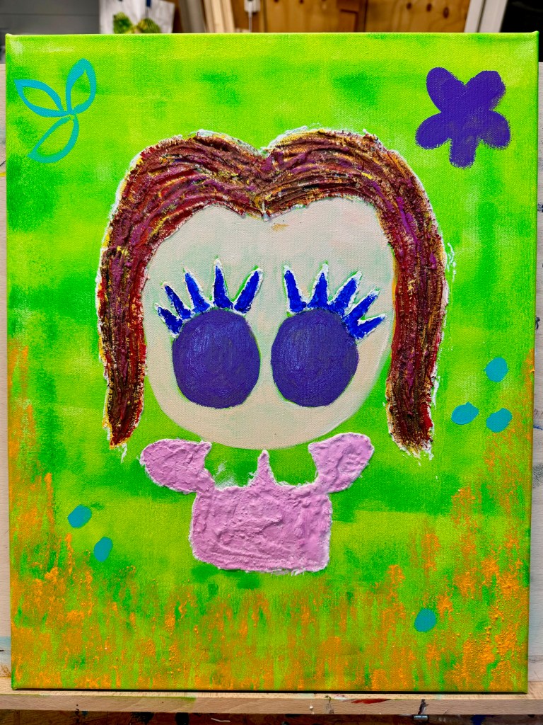 A variety of colors were used here including turquoise, cobalt blue, red, violet and magenta, all by Amsterdam Acrylics. I mixed and matched the colors to find the shades I wanted. Also it was important to create composition balance by knowing which colors to place where. For instance, the eyes and the large flower on the right hand corner were the same violet. The hair was so much fun to paint too! Rather than grab a brown paint, all I did was combine all the colors I had in hand and see what I can come up with!
