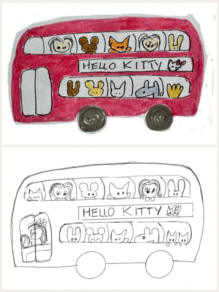 After a sketchbook doodle in Adventures in London during my trip to London last March, I thought I would expand on the double decker bus part and make a painting out of it. The photo of my doodle was cropped, imported on Procreate and traced on. This time, I added Little One as the driver and switched some of the characters by the windos to enhance the kawaii.