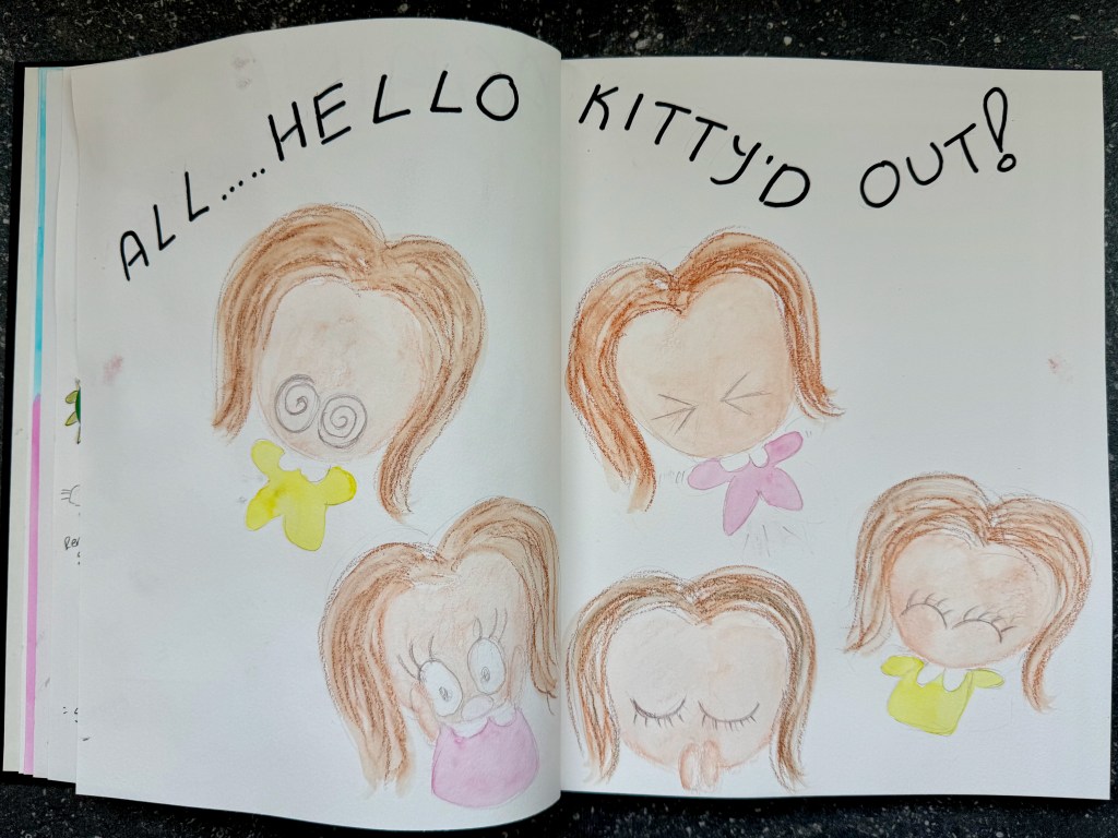 I am such a huge Hello Kitty fan and addictive collector of this adorable feline character! For over 20 years, I have been amassing her items through eBay, webshops in EU, suppliers both in Asia and the U.S., and of course whenever I am travelling to Japan! This of course comes at a price when you’re so overwhelmed that it almost takes over your life. On top of all the shopping I did when I was last back in Japan, I also have to contend with all the constant inflow of packages arriving on our doorstep. And now it is a matter of finding room at home to display and even store them! So here I am illustrating how I feel in my journal…