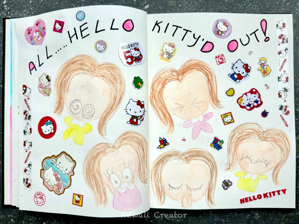 On a blank two page spread of Strathmore’s journal, I firstly scrawled in black pen: “All… Hello Kitty’d Out!” This was then followed by a pencil sketch of my varying emotions: overwhelmed, helplessness, panic, frustration, chill and calm then of course happiness. It’s because I am indeed happy with what I have already and though overwhelmed, look forward to sorting my stuff out and getting it all organized. The sketches were then colored in with a variety of water-soluble mediums like Caran d’Ache’s Neocolor II and Kuretake Gansai Tanbi Watercolors, followed by colored pencils.