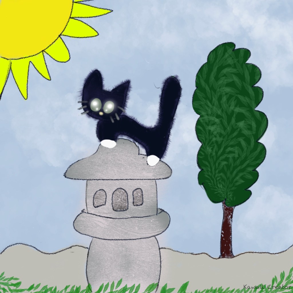 But what further caught my eye too was the owner’s cat. A black cat with white “socks”. How kawaii! She was prancing around the stone decorations with no care in the world. And there she also hopped onto one of the Ishidoro and decided that was her throne. And so adorable she was that I had to draw about that as soon as I got home! This time, it’s digital art.