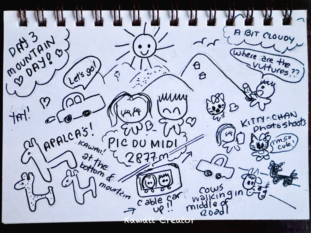 Whilst there, my partner was also searching for vultures to photograph. The misty clouds didn’t really help, and although he was disappointed not to find many, he did in fact end up with a few epic photos. And I myself took my Hello Kitty plushie out of my bag and did a mini photoshoot with her posing in different places! The doodle here unfortunately doesn’t do much justice to her but we did have fun. After a few hours on the summit, we called it a day and proceeded to our descent. Back to the car and hit the road, when a herd of cows were spotted meandering the road side. Stopped to take photos from the window until two of the cows began approaching us! I think they liked our Toyota Supra. They did turn around though and off we continued our journey back. And what a day it was, beautiful views of the Pyrenees and running into some wild animals… now I’m definitely inspired and can’t wait to start painting about them!