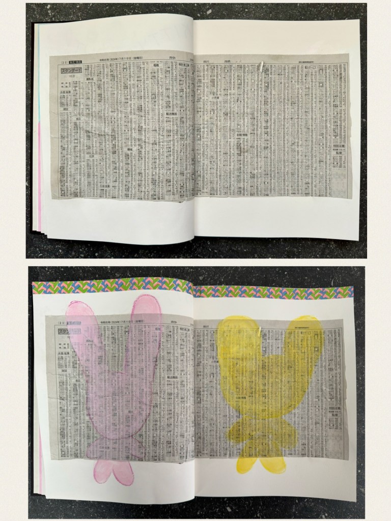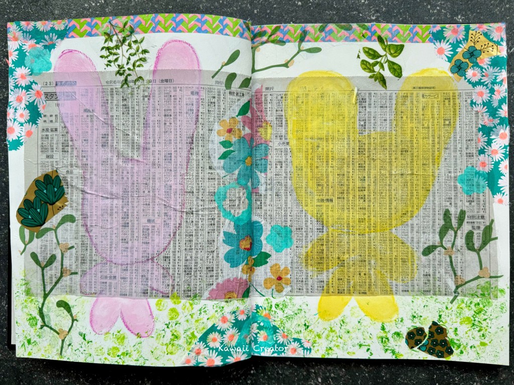 Session begins with gluing across the page an excerpt from a Japanese newspaper which turned out to be the Tokyo Stock Exchange listings! Hence, the title of this piece. I made sure that was all glued down evenly by sliding an old credit card up and down and across. And now what to do? The first thing that came to mind was painting something kawaii on it as a contrast to something austere like stock exchange listings! As I have done quite a lot of Little One paintings lately, how about some animals instead? It’s been a while since drawing bunnies and bears so I went for those, pink for the bunny and yellow for the bear firstly with Neocolor II oil pastel then filling in with acrylic ink. This was followed by a strip of washi tape across the top edge. I love how the bunny and bear are transparent so the Japanese letters show through!