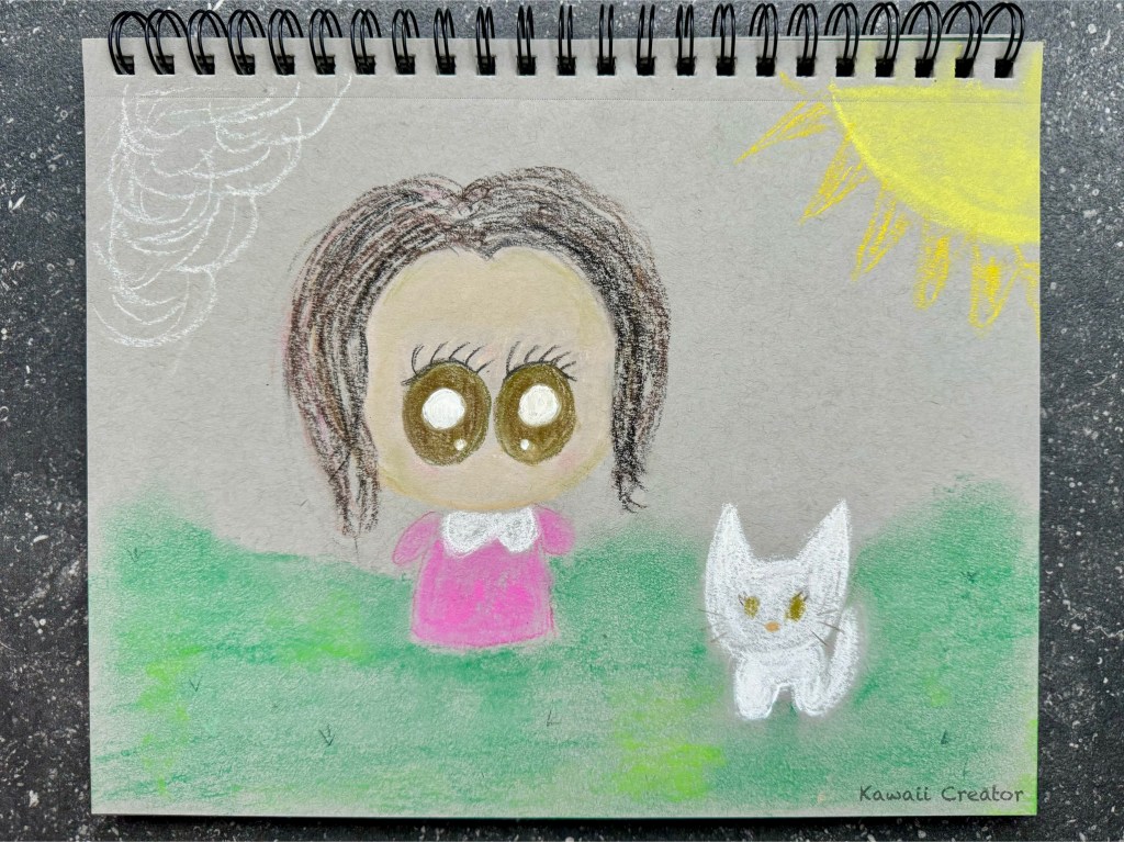 This time, a bit of dry media as recently been more into digital art or painting with acrylic or watercolors. How about some soft pastels then? I do love how the colors so vividly pop out and give that velvety texture. Hence a quick sketch this morning on some grey paper, taking an empty page of my Toned Grey sketchpad by Strathmore. First outlined with Stabillo’s Carbothello pastel pencils, then filled in with pastel sticks by Faber Castell for the brighter colors and Cretacolor’s brownscale set for the neutral shades. Pretty straightforward although getting the skin-tone on the face correctly was a challenge. I forgot how “chalky” pastels turn out to be on faces. As for the whites of the eyes, I admit to cheating a bit by resorting to white acrylic ink as I couldn’t manage getting the whites as desired with pastels. Nevertheless, here it is now… A quick spontaneous sketch of me with a new haircut and spotting a cute little white cat!