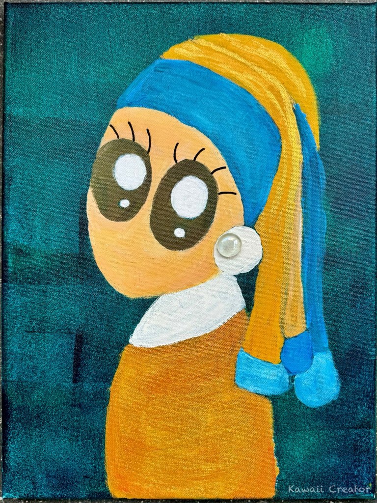 At some point point, I was not happy with the shape of her face as it looked a bit too “horsey” and hence I made it more angular. Now that’s better! Another challenge was giving more dimension to the subject with the light and shade, but of course I ended up cheating a bit by referring to the original Vermeer’s painting. To enhance my piece and give some variation to the original, I decided to paint the gown a deep gold and introduced light gold as highlights for the headscarf. The painting was then concluded with eyelashes for that kawaii touch, along with embellishing the earring with a pearlescent glass button. Et voilà!