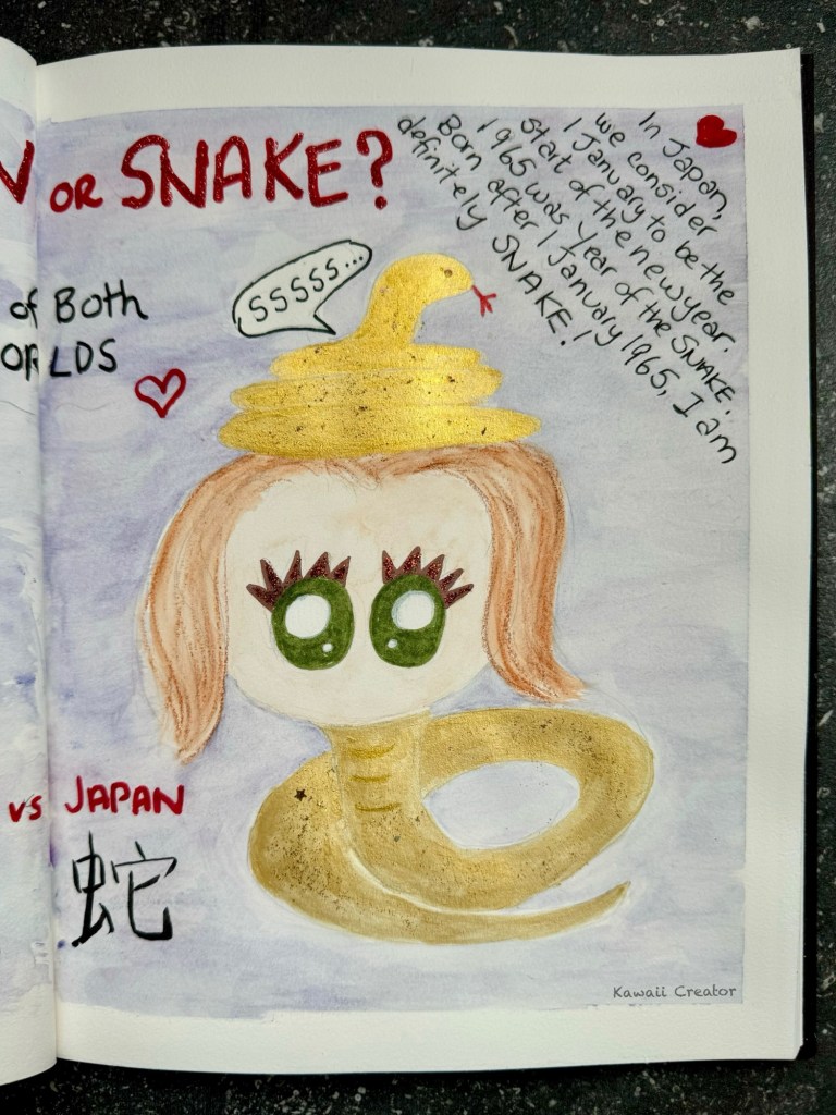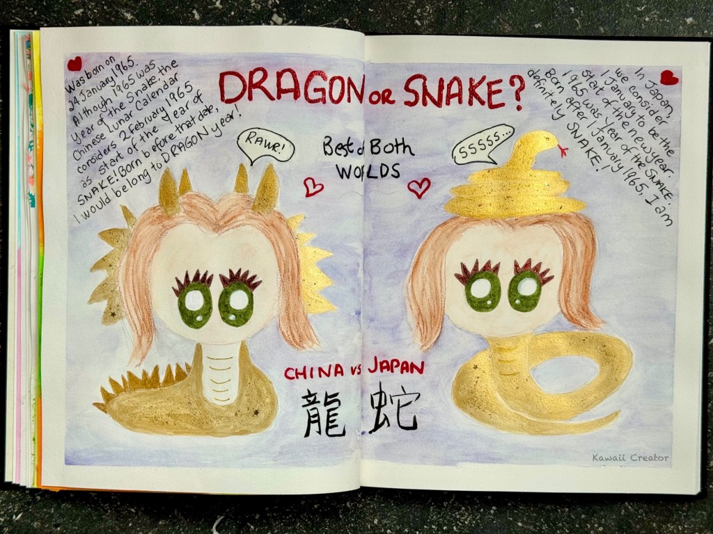I am so happy I was able to paint this!  Considering how unusual it is to fall under both animal zodiacs, it was worth illustrating it especially in a kawaii style.  Little One was so honored to be featured in this theme too!  By the way the Chinese/Japanese character for dragon is 龍 and for snake is 蛇 as seen in the painting.  Anyone else out there falling in the same situation as me due to cultural differences?