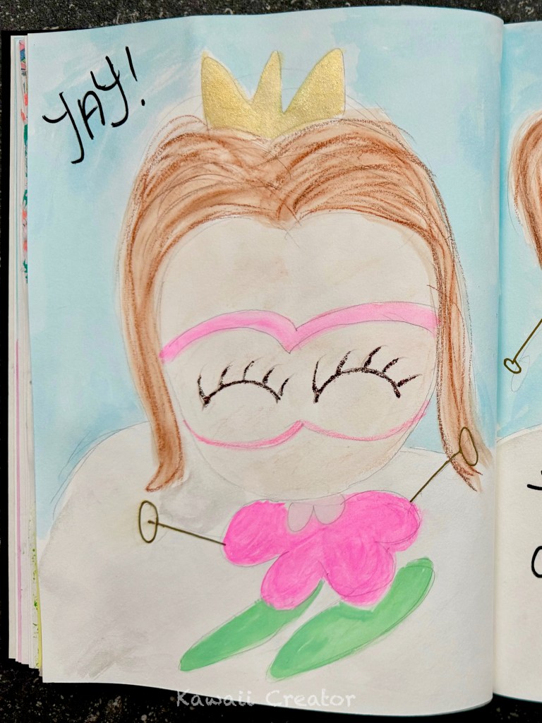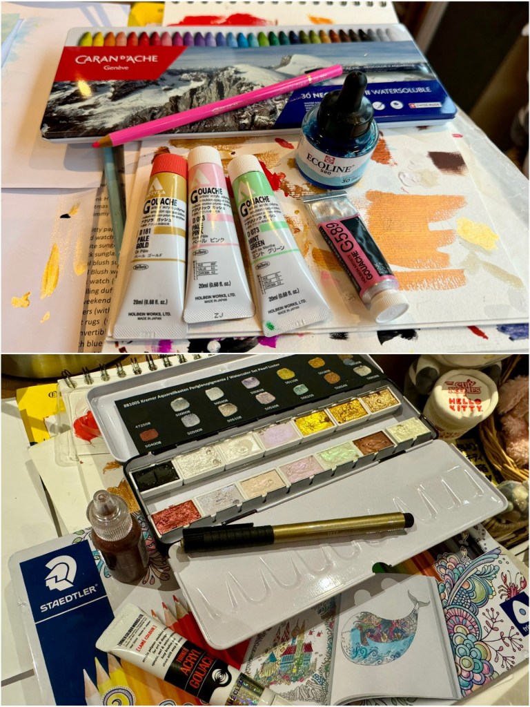 I even managed to set some time aside to paint all about it! After having a good doodle over it during my vacation (see last post), I decided to enhance it all on my larger sketchbook on a two-page spread of my Strathmore Mixed Media sketchbook. Supplies used include Ecoline blue ink for the sky and Kremer’s Pigment pearlescent white for the snowy ground. A selection of Acryla Gouache was for the outfits and skis whilst Caran d’Ache Neocolor watersoluble oil pastels for the face and hair. Textures were then added with metallic gold Faber Castell Pitt Artists Pen, Acrylic Gouache shimmer paint and Ranger’s Stickle glitter glue. Colored pencils were also used here.