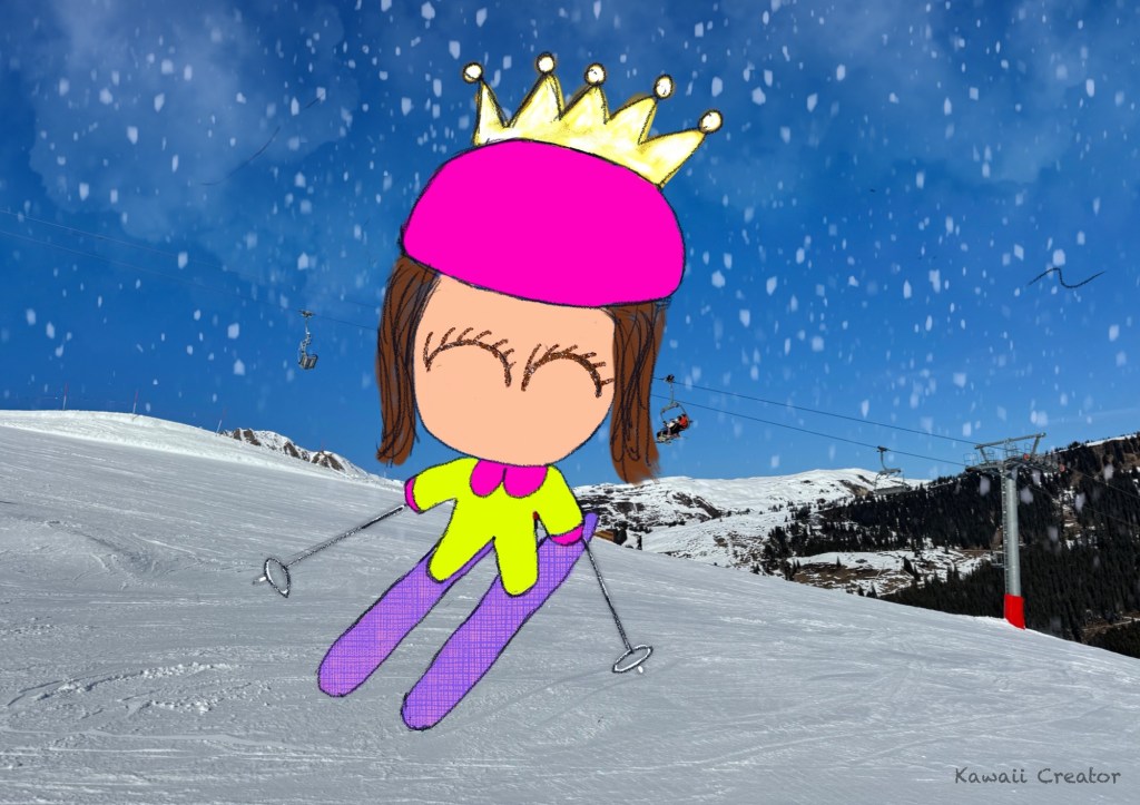 And just for fun, I made this kawaii digital painting! It’s me in the form of Little One having achieved that step forward. Fluorescent pink helmet cover with a gold “crown” on top is actually what I wear along with matching pink gloves and a neon yellow ski jacket. Thought the crown is kinda cute and funny. And you can’t lose sight of me, can you? Who knows, I might like to get a Hello Kitty helmet cover one day as well! And now for the background, I imported a photo I had taken during my ski break, a humble snow-covered landscape with ski lifts behind, as typical of ski pistes as you can get. This photo was then Gessian blurred before introducing clouds and snow with the relevant texture brushes. With the Procreate Pencil, I then sketched Little One before coloring her in with the Medium Airbrush. Then the textures were added, mainly with Gold Rush brush for the crown to enhance the bling. And don’t forget those sparkly eyelashes traced over with Glitter Brush pen! And what positive vibe this painting brings. Hoping for more positive vibes too for future ski adventures to come!