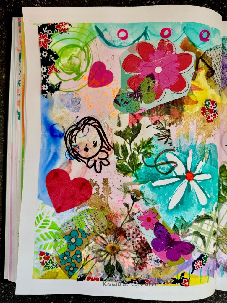 And indeed after days of working on this painting, tweaking and adjusting, I am very happy with it! Love all that chaos which yet comes with abundance and lots of positive vibes. And so much energy too! After this dark dreary weather, we could all do with some. Let’s also not forget the cuteness which is further enhanced with Little One and Hello Kitty. What a kawaii combo they make! I definitely want to create more of such similar paintings like this: Sweet and happy!