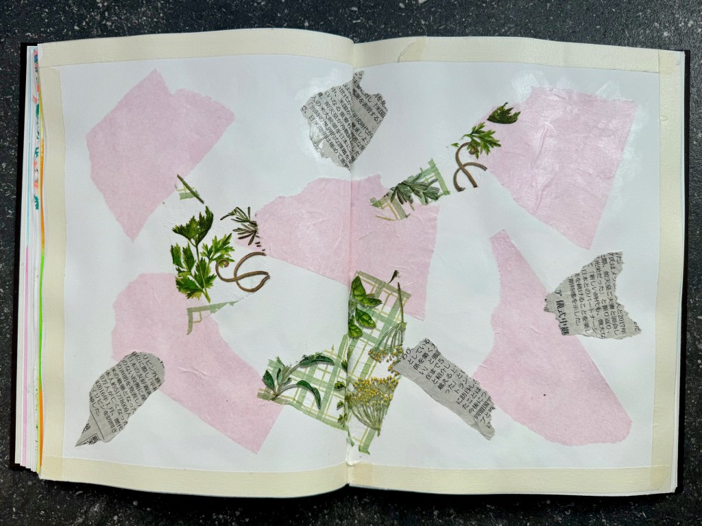 Well what do you know, it all began even during the middle of January and hence still in the middle of winter! Random bits of paper were collaged together in my sketchbook: pink wrapping tissue, paper napkins and Japanese newspaper, resulting in a rather Spring theme. I must have been bored or just needed some inspiration to start from, and it looks as though I were subconsciously craving for warmer weather: Those green leaves and the Sakura cherry-blossom pink are no coincidence! And as I got busy, this page got completely forgotten until I came back from my ski trip a few weeks ago and wanted to sketch but realized this page needed to be completed. Well now that we are in March now, why not resume it and make it a full-on Spring theme with happiness, cuteness and lots of pretty flowers?