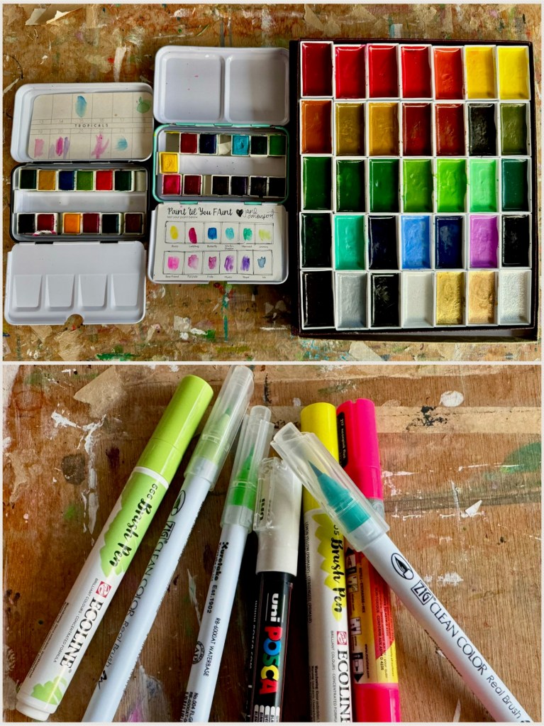 First just playing around with watercolors. I went for Jane Davenport’s paint boxes as I love those beautiful vivid colors and also Kuretake Gansai Tambi for its intensity. On a sheet of Canson’s A4 Watercolor paper (hot pressed, although Alena used cold-pressed), we just painted away intuitively, just going with the flow and watching the colors magically merge and feather. I especially enjoyed seeing how the various colors manage to sync together in harmony. Stunning so far, isn’t it?
