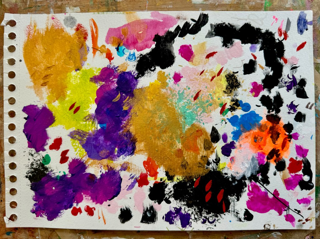 After the fun but intensive Watercolor Wonder classes with Alena Hennessy, I thought I’d give my paintbrushes a rest and try something totally different! That last unit, Four Muses, involved painting portraits, five of them in fact (four plus a bonus one) of Little One in different themes. And of course she enjoyed being my model and muse, but she was exhausted! “It was so much fun dressing up and sitting for this exciting class though”, she mused. So let’s give her a break for a few days. And now, I too needed a break but was still in a creative mood. Next to me lay an old sheet of A4 paper which I use as a palette for my paintings. Colorful isn’t it? And too beautiful to toss out.