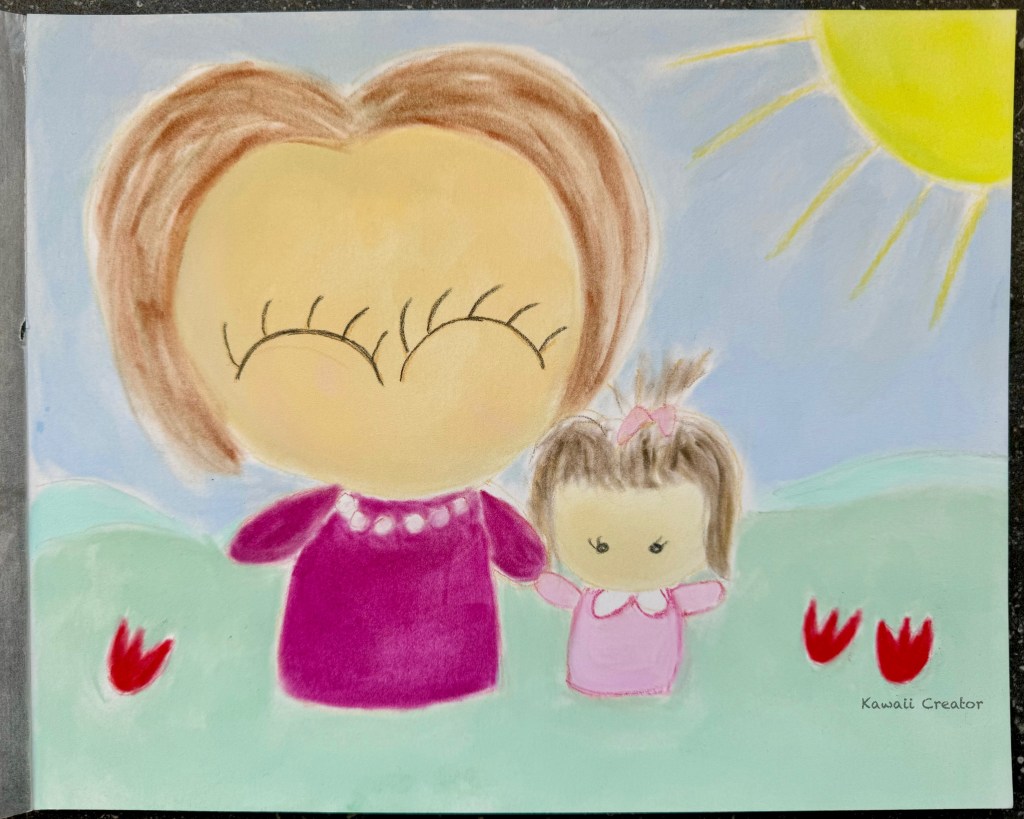 Although mama and I were very close, perhaps the happiest moments were when I was just a little girl. That age when you’re not yet in school, haven’t made friends yet and feel the closest to your mother. As such, I was keen on the “mama and baby” theme which of course also enhances everything kawaii about our relationship. My mother was very stylish and dressed impeccably, which was typical of the mid-60s, and that rubbed on me as I was growing up. She’d dress me up as well, down to matching ribbons in my hair. Although we lived in central Tokyo, we walked in parks quite a lot and enjoyed seeing all the pretty flowers. Mama sadly passed away in 2012, but the fond memories remain. What I would do to get those wonderful days back with my mother though! And now this painting comes to light…
