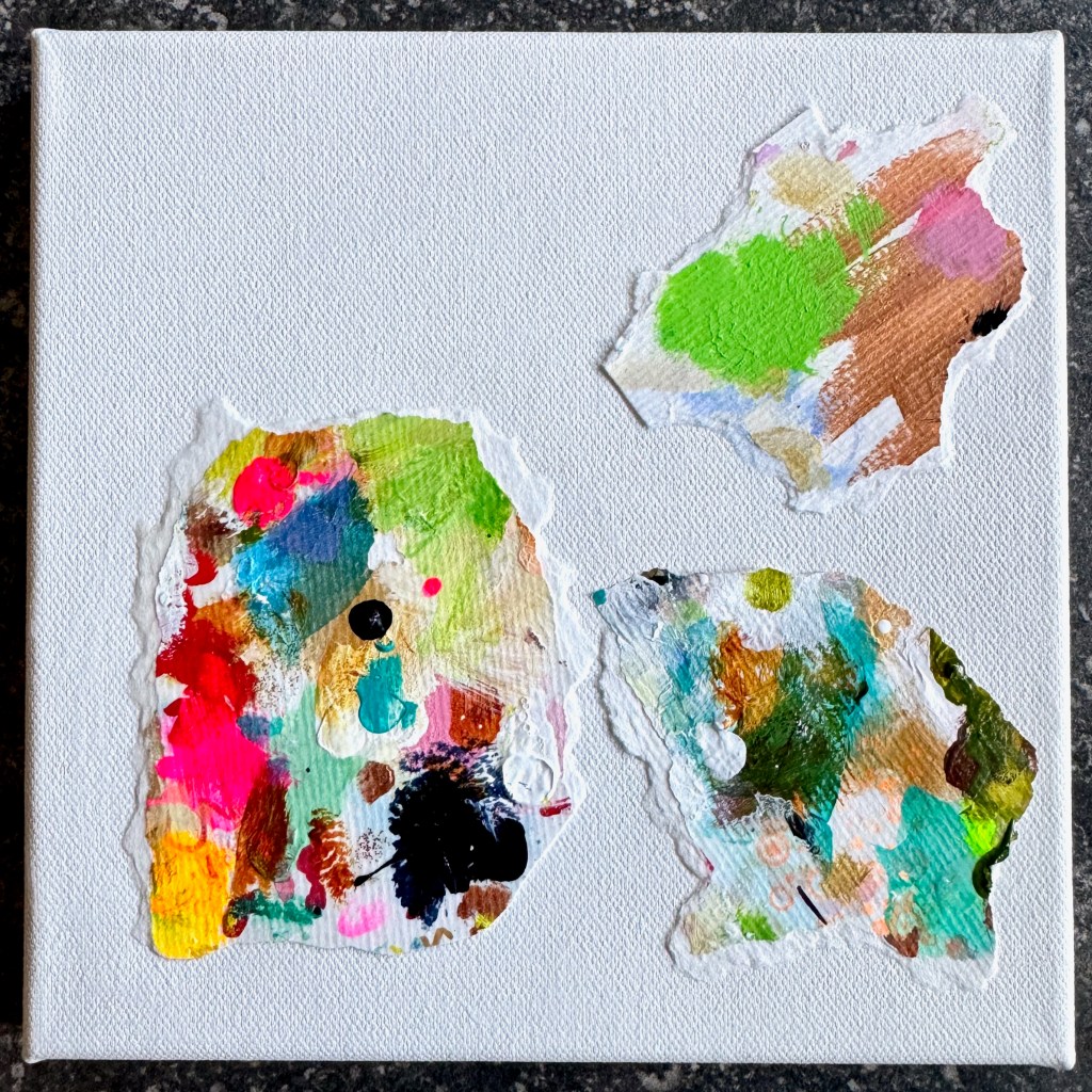 In this class, Juliette demonstrates another idea: integrating another painted page as a collage in your artwork! Painted page refers to any kind of doodling or random bits and bobs you paint on a separate piece of paper which you can later tear or cut up and recreate. In my case, my “painted page” is a sheet I typically use as a paint palette on which I blot, test or mix colors. It is not my first time I have made artwork from them, as I frequently paint over them and recreate. On this occasion, though, we tear them up and glue them onto another sheet. Here is mine on a small 20cm x 20cm canvas. How colorful is that!