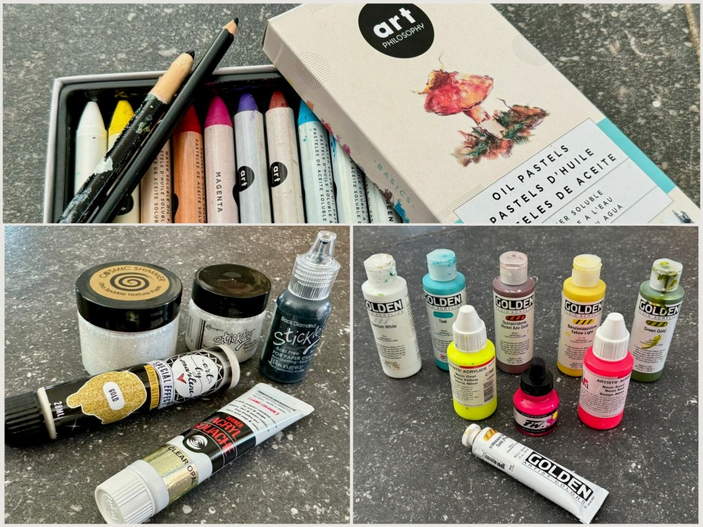 Spreading water-soluble oil pastel colors with white acrylic paint worked really well. What a brilliant idea, and why didn’t I think of that before! Here I went for pastels by Art Philosophy, whilst the paint by Golden fluid acrylic. Teal and Green Gold make an amazing combination for the background as well, And we love those neon colors by ARA! They’re great as subtle accents. For glitter, I went for Stickles by Rangers, jar of white Cosmic Shimmer, Art by Marlene in Fold and Turner’s Acrylic Gouache in Lame Clear Opal.