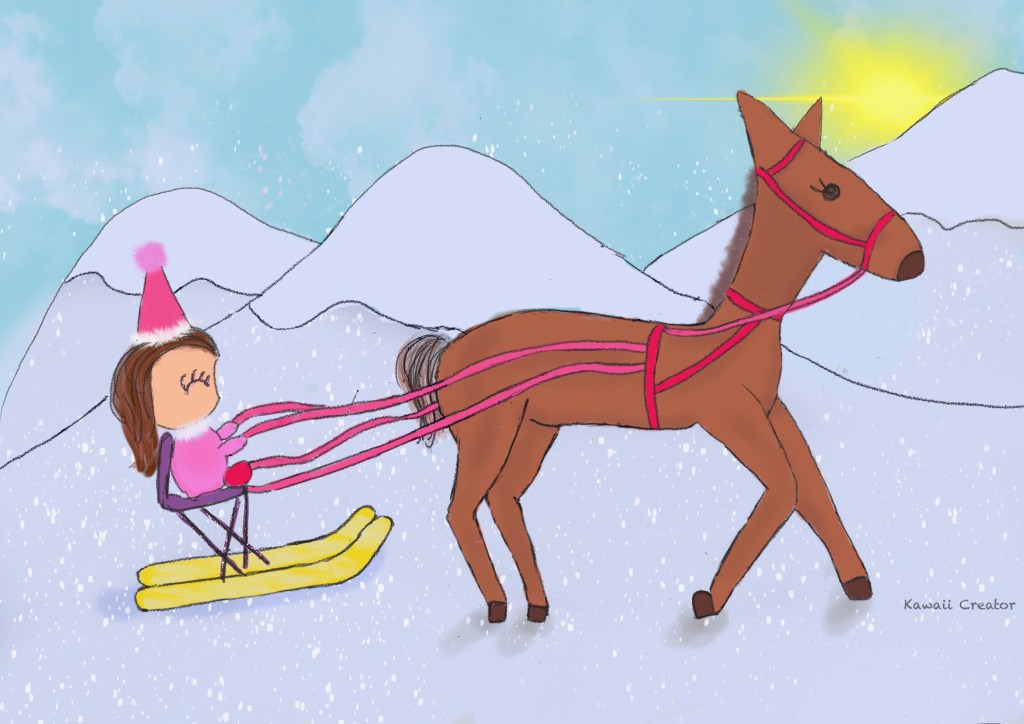 Continuing from my last blog entry, I am now sharing here the next painting from the White Turf event last winter! These are from the series from the White Turf horse event on snow back in February which I had sketched on Procreate and wrote about in White Turf 2025 Sketches. To recap, it is horse race event on snow that takes place every year in St. Moritz, Switzerland involving a variety of styles as illustrated below. What great way to practice drawing horses again and incorporating the “kawaii” elements by featuring Little One! And as promised, I colored them all in during my free time and in between my busy schedule, finally completing the set recently.