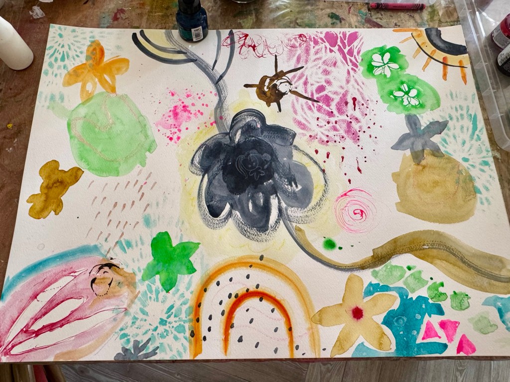And now I’m back home, after a week of Tracy Verdugo‘s abstract painting retreat in Montelparo, Italy. And what am inspiring and fun one it was! As mentioned in my last blog, it’s my second one with her, the last being in Cambodia five years ago, I always enjoyed her classes on-line too, and although the start of the course is a repeat from the previous, it is good to refresh our skills and more importantly, observe how much we’ve both developed over the years. On the first day, we started the morning with a warm-up and some mark-making exercises.