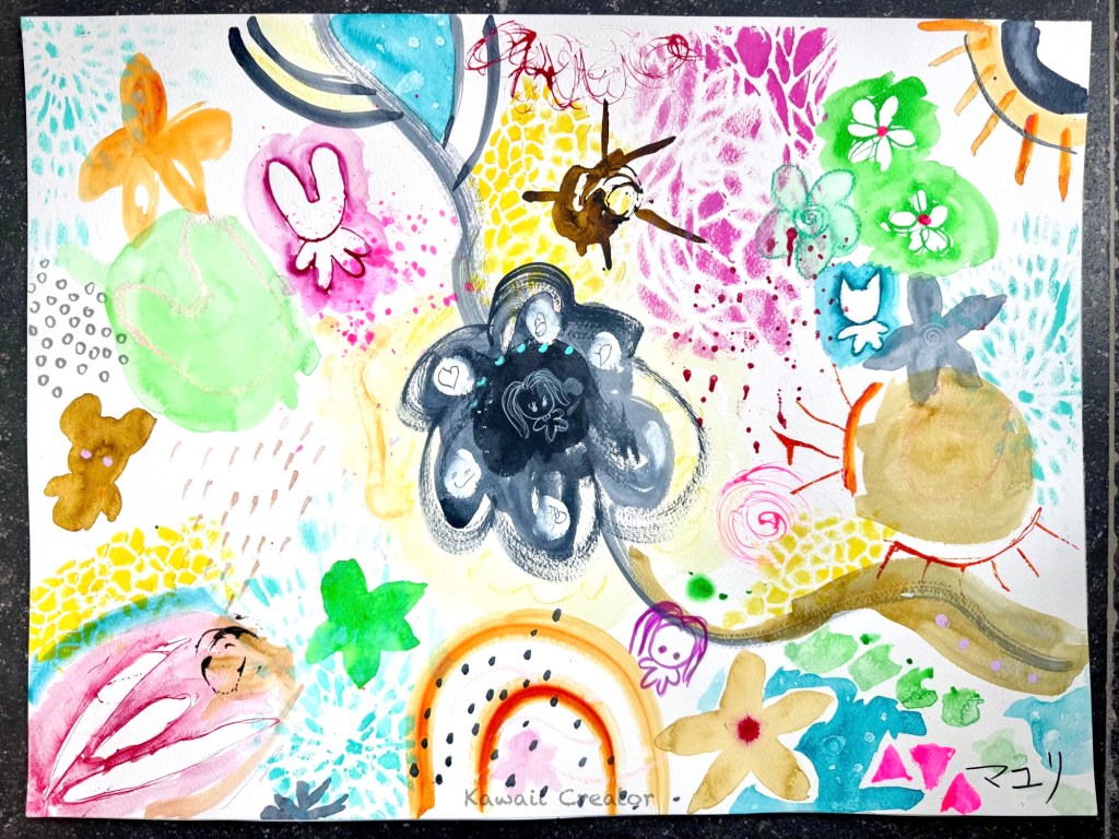 A variety of mediums were used but mainly acrylic ink. Tracy introduced us to various ways to apply them and combine with other mediums like soluble oil pastels, crayons, gouache, markers, colored pencils. Nothing new to me, but as I don’t get to work with huge 18″x24″ much, I did struggle with how to fill the spaces up and got stuck occasionally. Nevertheless Tracy reminded me to work with contrasting pairs (dark and light, straight and undulating, thick and thin, angular and round and so forth). And eventually I began introducing my cute little characters like Little One to bring on the kawaii elements.