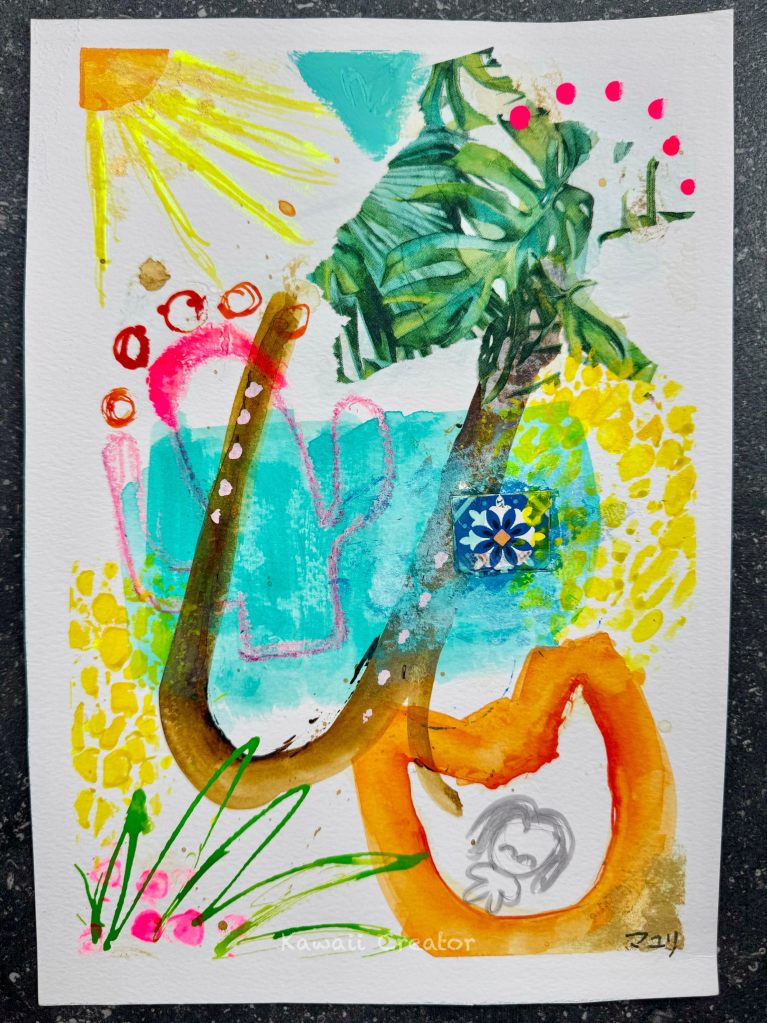 Sharing here the second part of my Cute Quartet mini painting series! This set was created during Tracy Verdugo’s art retreat in Montelparo, Italy last week. As outlined in my last blog, Rabbit in Strawberry Moon, we were to create four mini paintings by firstly dividing a huge piece of paper into four equal parts with masking tape. Then we had to come up with a four-lettered word (!), paint each letter on each square and develop four different mini paintings as a fun way to practice abstract painting techniques and experiment with various mediums.