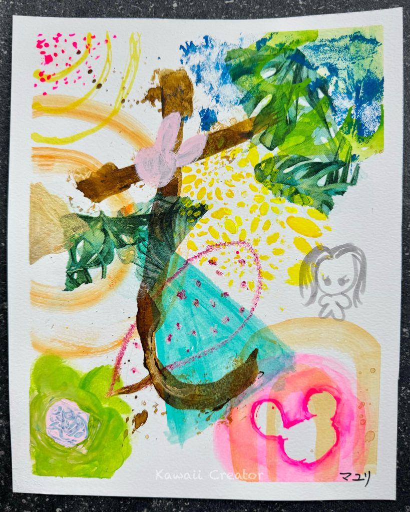 Sharing here the third part of my Cute Quartet mini painting series! This set was created during Tracy Verdugo’s art retreat in Montelparo, Italy last week. As outlined in my first blog for the series, Rabbit in Strawberry Moon, we were to create four mini paintings by firstly dividing a huge piece of paper into four equal parts with masking tape. Then we had to come up with a four-lettered word (!), paint each letter on each square and develop four different mini paintings as a fun way to practice abstract painting techniques and experiment with various mediums.