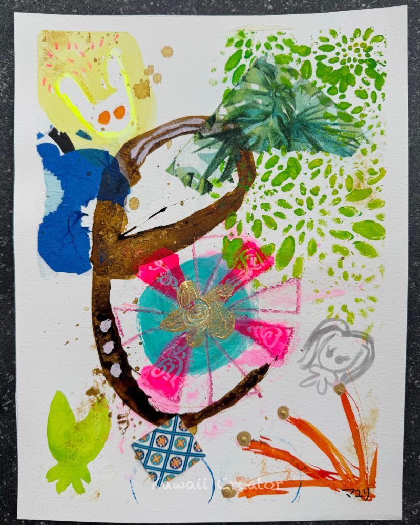 Sharing here the fourth and final part of my Cute Quartet mini painting series! This set was created during Tracy Verdugo’s art retreat in Montelparo, Italy last week. As outlined in my first blog for the series, Rabbit in Strawberry Moon, we were to create four mini paintings by firstly dividing a huge piece of paper into four equal parts with masking tape. Then we had to come up with a four-lettered word (!), paint each letter on each square and develop four different mini paintings as a fun way to practice abstract painting techniques and experiment with various mediums.