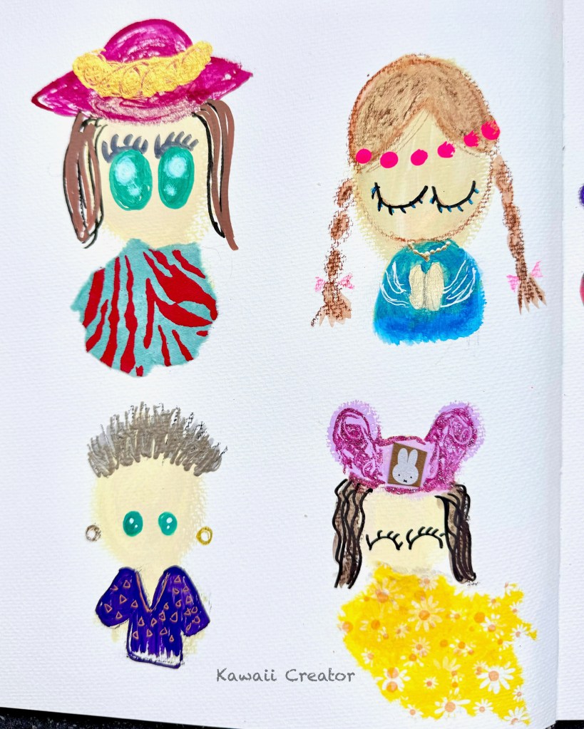 I was glad to be able to complete the assignment once I returned home to the Netherlands. Not only could I take my time and continue at my leisure, but also have the comfort of my own home with my own art supplies, especially the ones I didn’t bring with me. This included gel pens, 3D liners, glitter glue as well as other paints. Just love how it turned out! So far here we have, clockwise from the top left: Little One in poncho and hat Peruvian style, then dressed all hippy in braids, then another hippy chic one in a mouse hat featuring Miffy, and finally as a Punk! Characters that never crossed my mind till now. And soon, I will share with you the other half of my assignment so watch this space!