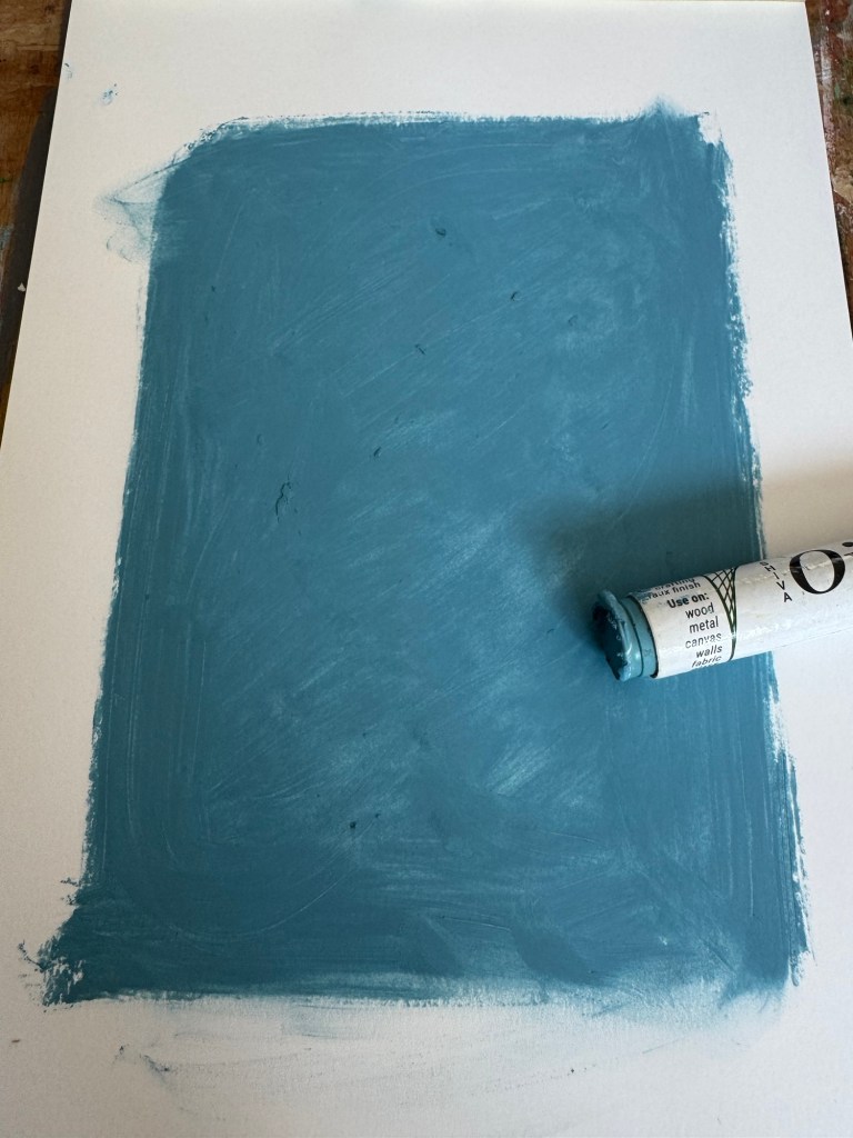 This unit is Workimg Backwards during which we firstly apply a layer of color before drawing our animal. Then we fill it all in, thereby piling up more paint and adding more depth. I went for an A4-sized Bristol paper here and colored in a teal rectangle with some Shiva Oil paint stick. Like Julliette, I left the sides of the paper blank.