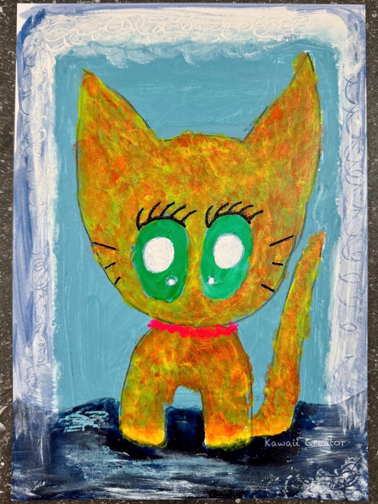 Once dry, I proceeded in outlining my cat with a black marks-all pencil. Then comes the fun part: filling her in!. Ginger was painted in a combination of yellow and orange, applied with fingers for a stippled effect. Eyes were colored in with iridescent green with a brush. Then the edges of the paper and ground were in Payne’s Grey, further layered on with white oil paint stick and acrylic paint. Details were then incorporated with fluorescent red collar, then black marker and traced over with glitter glue for the lashes. And look how sweet she looks now!
