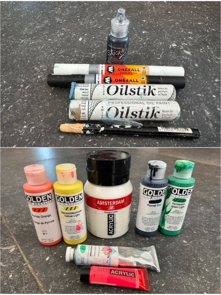 And here is what I used for this cute painting! Shiva oil paint sticks are great as they dry rather quickly. As for paint, Golden Fluid Acrylic is typically used, but for the iridescent green, I went for Old Holland. Amsterdam Acrylic is also another recommendation as they’re more affordable but still professional grade. For paint markers, I like Molotow.