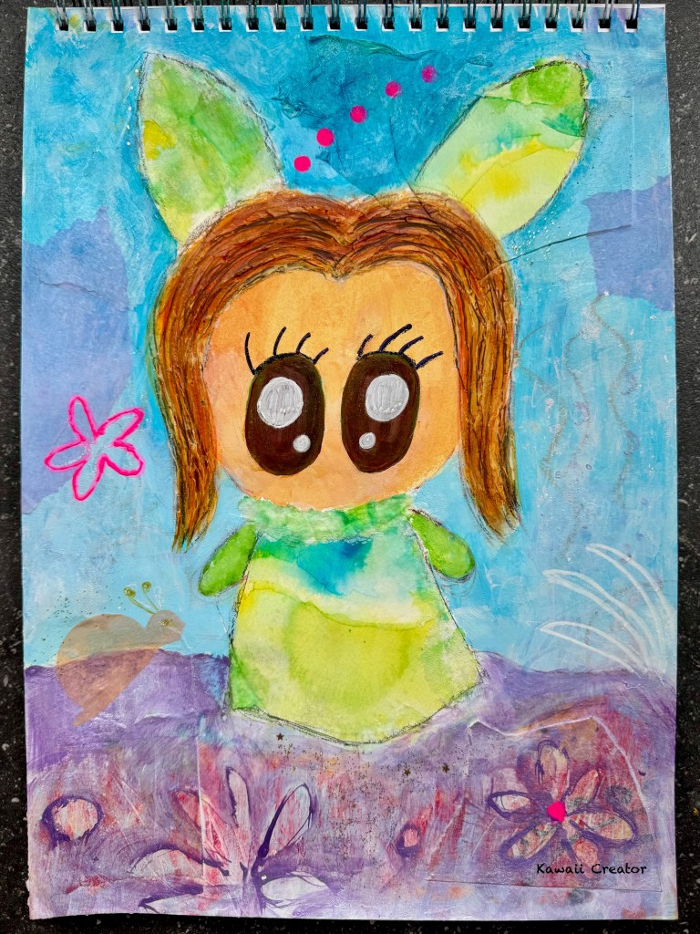 Once I got started and began adding colors and bits of collage paper as background, I drew my character, Little One. The rest of the process didn’t come easily though. It was a process of trial and error, layer after layer, covering bits I didn’t like and getting innovative with the “beautiful mistakes”. I even went through a few “ugly phases” and had to abandon the paining for a few days, work on something else and then return to it. In the end though, I made it, as the rest followed through smoothly. Even one of the collage papers incidentally resembled a snail shape, as we see here. Naturally that allowed me to develop the idea of a magic garden!