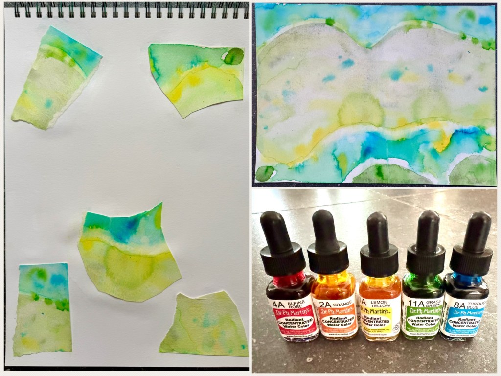 It all begins with a watercolor painting I had started with Dr Ph Martin’s Radiant Concentrated Water Colors. I was attempting to paint a landscape of mountains by the lake but unfortunately it didn’t come out as I was hoping. Rather than throw the whole painting away to waste, though, why not recycle it for another artwork? And hence the painting was torn to bits and randomly glued onto a page from Canson’s A3 Media Paper pad (300 gsm). Just as Little One recycled the material she had gotten at the charity shop, I recycled this unwanted painting too!