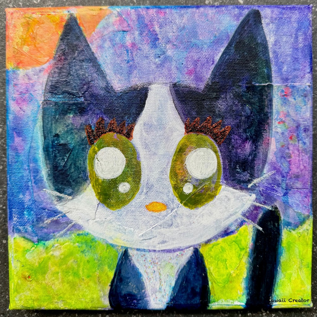 I think I’ll go for a tuxedo cat this time. That’s right, I’m still saddened about that new neighborhood cat who never returned! Remember that cute little kitty I came across a few weeks ago about which I shared here along with my sketch Anyone Seen This Cat? Perhaps this would be an opportunity to pay further tribute to her! On this colorful background, then, I set about sketching my cat with water soluble pastel before filling her in with titanium white and payne’s grey acrylics. The eyes were then painted in green gold. I didn’t work on the background too much as I loved how it was already. All I did was introduce the sunset and the grass. Finishing touches included some glitter on her eyelashes and her whiskers as well as part of her body. And now!