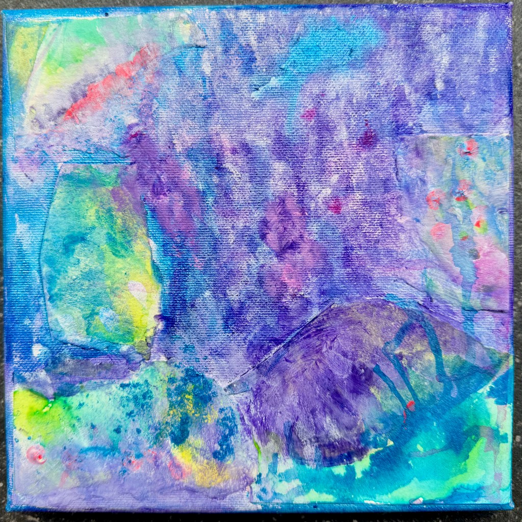 And here comes the next unit, More Ways to Add Painted Pages. And what is meant by “panted pages” in this case? They are merely sheets of paper on which you painted either as an experiment, blotting or mixing paint or even as an artwork you had started and no longer liked but prefer to recycle instead of throwing away. And now, on a square 20×20 cm canvas, I begin by tearing out and glueing on some painted pages. Mine were bits from an unwanted landscape painting I no longer liked. Can you see it? It’s in yellow and green. A variety of acrylic inks (violet, magenta, pearlescent blue, fluorescent red and bit of white) and sprays of isopropyl alcohol were then layered on to create this mysterious effect. Let’s see what we can create next!