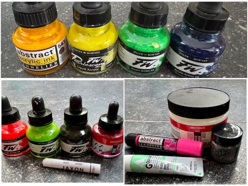 Art supplies used: Started with a variety of acrylic inks by Sennelier and Daler and Rowney them added colored tissue collages with acrylic binder and scribbled a bit with white oil pastel. Stencilimg was done with Mint Green gouache and textures introduced with 3D liner and glitter glue.